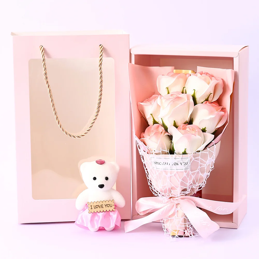 Celebrate love and warmth with our enchanting Artificial Rose Bouquet Gift Box, featuring delicate soap flower roses and an adorable teddy bear companion. Each rose is meticulously crafted from high-quality fragrant soap, designed to retain its beauty and gentle scent long-term—no watering or fading. Paired with a soft plush teddy bear, this set expresses affection in a timeless, keepsake form. Ideal for Valentine’s Day, Mother’s Day, anniversaries, or home décor accents, the elegant gift box is ready to present, adding a touch of romance to any room.